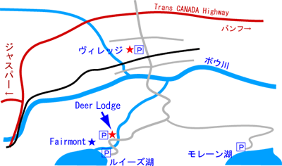 レイク・ルイーズはルイーズ湖畔とボウ川沿いのヴィレッジの2箇所に中心がある。湖畔には五つ星のフェアモントと三つ星ディア・ロッジの2軒のホテルがあるが他には何も無い。我々貧乏人は当然ディア・ロッジ。