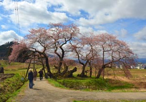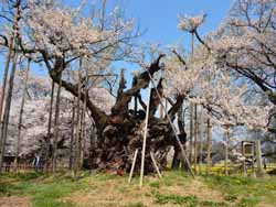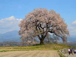 樹齢650年のエドヒガン桜。大河ドラマ「八重の桜」のオープニングバックに使われた。複数本に見えるが、全て同じ株から出ている。開花が始まったばかりで豪華さは無いが、畑の真ん中にぽつんと佇む姿に素朴さを感じる。