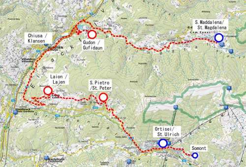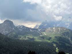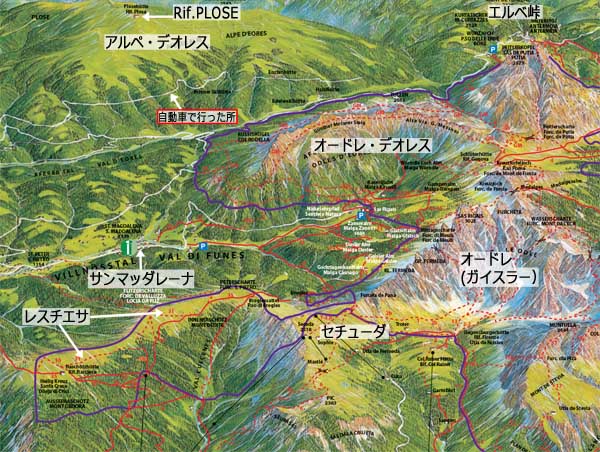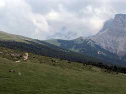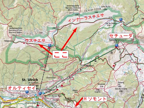 距離的にはガルデナ峠を越えるルートが一番近いが、天下の難所ポルドイ峠を抜け、その南側にある草原Gardeciaを歩く予定。