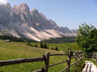宿には多くのドイツ人が宿泊していた。特に食堂で隣のテーブルに座っているドイツ人の中年夫婦は英語も話し、人なつこく何度か会話をした(ライプツィッヒ近郊に住んでいるとのこと)。この時期、夏ダイヤになる直前でまだ交通の便も悪いが、水曜と土日はオルティセイ(ガイスラーの南側の町)への直行バスが朝と夕方出る。ドイツ人たちは今日このバスでオルティセイに行き、そこからあの岩峰を越えて歩いて戻って来たとのこと。