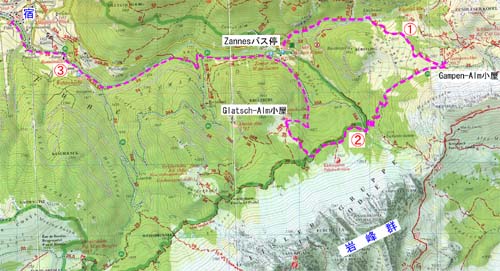 今日は、より高みの牧草地 ガンペン・アルムを歩く。夏季(6/23以後)は4km先のツァンサー・アルム(Zanser