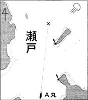 A丸が進路上にある北東に口を開けた瀬戸に差し掛かったところ、瀬戸の北口からの波浪の影響を受けて船休の動揺が激しくなった。船長は、波浪が2ないし3メートルとなったことを認め、前方の見通しが悪くなってきたことから手動で操舵に当たった。同北口に接近するに伴って波浪も更に高まることが予想される状況ではあったが、もう少し航行を続けて無理なら引き返せばよいだろうと思い、速やかに航行を中断することなく続航した。